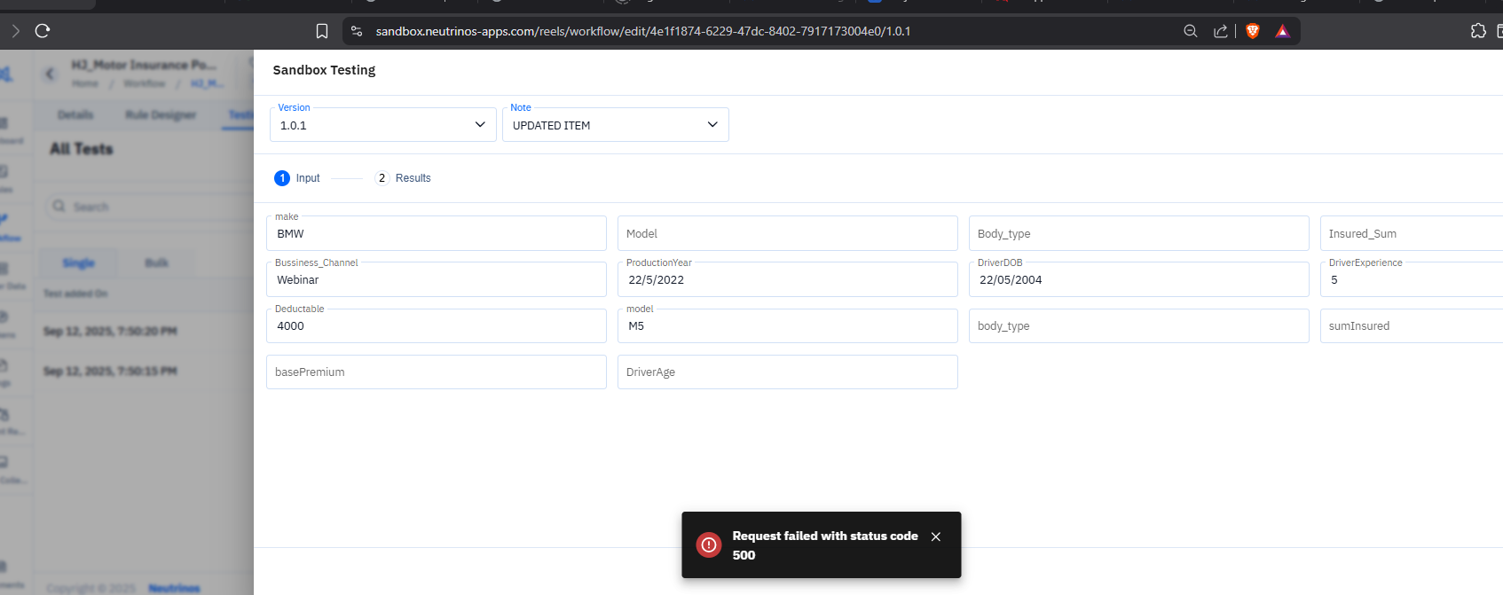 Please ensure that all field values are entered correctly. Additionally, verify that the driver’s age is provided in the correct format — it appears the Driverage field has been set as a date format. Kindly change it to either a number or a string and update it to the proper age format.