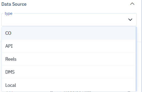 This creates a data source selector and mapper in Alpha Studio. When a user selects a type like Local, CO, API, or DMS, the UI expands to let them map external or local data into your plugin.
