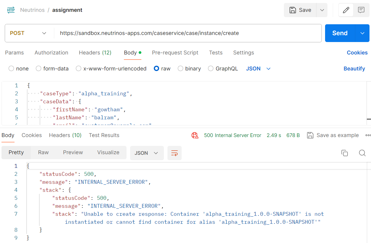 I am trying to create a new case instance under the case type “alpha_training” using the provided cURL, but getting 500 error as follows: